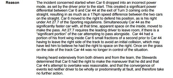 Ne vjerujem kada je rekao da je potpuno bio svjestan gdje je Lewis i kojom brzinom dolazi. Bio je jako lijevo (na trkaćoj liniji) i drkao po volanu.....razlika u brzini je bila jako velika. Govore 17 km/h kod dodira, ali kod izlaska iz zavoja 3 je to izgledalo puno više.