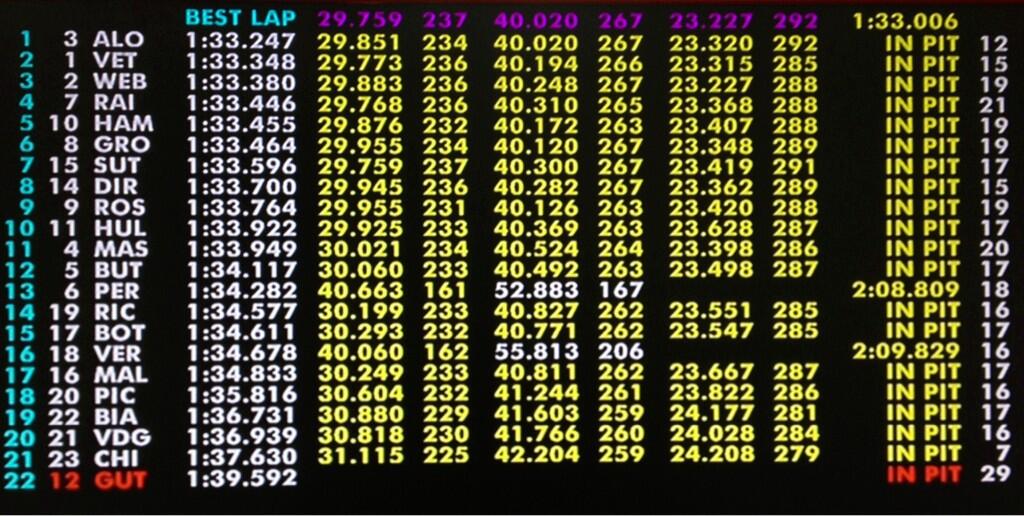 Istina, ali me to čudi jer je Alonso (navodno) 3. po speed trapu, ispred su samo Sutil i di Resta, ali ovo baš ne bi trebalo biti relevantno jer je to bilo pokazano cca. pola sata prije kraja.